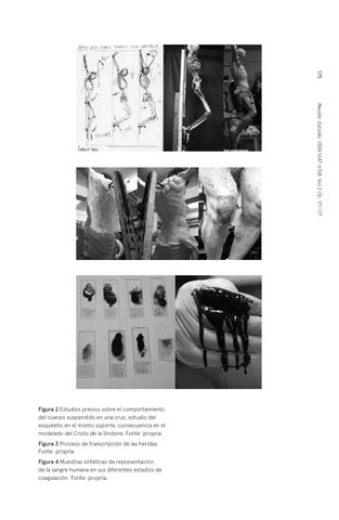 Figura 2 Estudios previos sobre el comportamiento del cuerpo suspendido en una cruz, estudio del esqueleto en el mismo soporte, consecuencia en el modelado del Cristo de la Síndone. Fonte: propria. Figura 3 Proceso de transcripción de las heridas. Fonte: propria. Figura 4 Muestras sintéticas de representación de la sangre humana en sus diferentes estadios de coagulación. Fonte: propria.