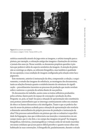retórica construída através do jogo entre as imagens, o artista transpõe para a pintura, por exemplo, a coloração antiga das imagens e ilustrações de revistas e jornais dos anos 50. Nesse sentido, os documentos propõem questões à pintura que podem ir além do aspecto semântico da imagem. A atenção do pintor não se restringe ao objeto, ao referente fotográfico, mas também à qualidade de sua aparição, à sua condição de imagem configurada pela relação entre luz e pigmento. Este momento, anterior à instauração da obra, compreende a coleção, o arquivamento, o estudo das imagens de referência, as montagens dos documentos, tanto as relações formais quanto o estabelecimento de estruturas de significação – procedimentos inerentes ao processo de produção que muito revelam sobre o universo e a posição do artista diante de sua poética. Os documentos de trabalho, assim como os textos reflexivos produzidos pelos artistas, fazem parte do espaço de concepção e produção da obra. Pergunta-se, pois, se trazê-los para a situação de apresentação não constituiria uma postura autorreflexiva que se interroga continuamente sobre seu estatuto de obra e os liames discursivos a ela interligados. Trazer o que se poderia chamar de avesso da pintura acabada para a situação de apresentação não revelaria a dimensão autorreflexiva do próprio processo de produção e instauração da obra? Um processo autorreflexivo em pintura que não se reduziria à especificidade da linguagem, mas que evidenciaria sua inserção e cruzamentos em um campo maior, que é o da Arte, e no campo das imagens em geral? As imagens fotográficas, televisivas, cinematográficas e virtuais estão de tal modo inseridas em nosso cotidiano que já nos parece difícil perceber o quanto nosso olhar está habituado às suas convenções. A fotografia foi, paulatinamente, durante o século