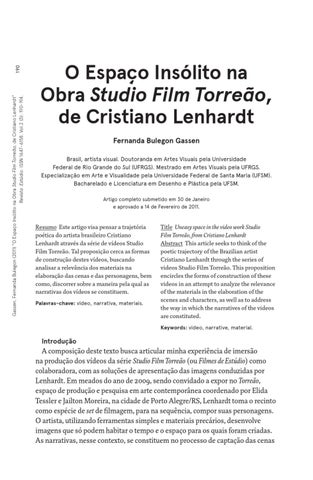 O Espaço Insólito na Obra Studio Film Torreão, de Cristiano Lenhardt Fernanda Bulegon Gassen Brasil, artista visual. Doutoranda em Artes Visuais pela Universidade Federal de Rio Grande do Sul (UFRGS). Mestrado em Artes Visuais pela UFRGS. Especialização em Arte e Visualidade pela Universidade Federal de Santa Maria (UFSM). Bacharelado e Licenciatura em Desenho e Plástica pela UFSM. Artigo completo submetido em 30 de Janeiro e aprovado a 14 de Fevereiro de 2011.