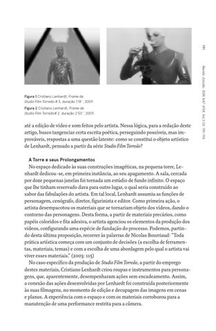 até a edição de vídeo e som feitos pelo artista. Nessa lógica, para a redação deste artigo, busco tangenciar certa escrita poética, perseguindo possíveis, mas improváveis, respostas a uma questão latente: como se constitui o objeto artístico de Lenhardt, pensado a partir da série Studio Film Torreão? A Torre e seus Prolongamentos