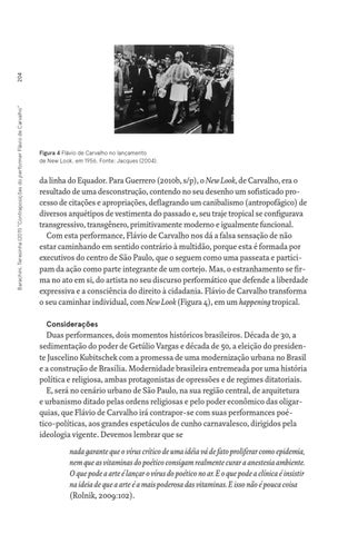 da linha do Equador. Para Guerrero (2010b, s/p), o New Look, de Carvalho, era o resultado de uma desconstrução, contendo no seu desenho um sofisticado processo de citações e apropriações, deflagrando um canibalismo (antropofágico) de diversos arquétipos de vestimenta do passado e, seu traje tropical se configurava transgressivo, transgênero, primitivamente moderno e igualmente funcional. Com esta performance, Flávio de Carvalho nos dá a falsa sensação de não estar caminhando em sentido contrário à multidão, porque esta é formada por executivos do centro de São Paulo, que o seguem como uma passeata e participam da ação como parte integrante de um cortejo. Mas, o estranhamento se firma no ato em si, do artista no seu discurso performático que defende a liberdade expressiva e a consciência do direito à cidadania. Flávio de Carvalho transforma o seu caminhar individual, com New Look (Figura 4), em um happening tropical. Considerações