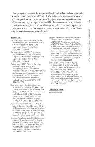 Carvalho, Flávio de (2001) Experiência n.2: realizada sobre uma procissão de Corpus Christi: uma possível teoria e uma experiência. Rio de Janeiro: Nau. ISBN 85-85936-44-4 Carvalho, Flávio de (2001). Experiência n.2: realizada sobre uma procissão de Corpus Christi: uma possível teoria e uma experiência. Rio de Janeiro: Nau. ISBN 85-85936-44-4 Freitas, Nanci.(2007) Flávio de Carvalho e Oswald de Andrade: actantes provocadores e atos performáticos. Belo Horizonte, Brasil: IV Reunião Científica de Pesquisa e Pós-Graduação em Artes Cênicas, UFMG, 2007. [Consulta em: 2010-12-05] Disponível em http:// portalabrace.org/memoria1/?p=474 ISSN:2176-9516 Guerrero, Inti. (2010a).Blog: Cidade do Homem Nu. Documentação da Exposição Cidade do Homem Nu, no Museu de Arte Moderna de São Paulo. Guerrero(curador). 2010. [Cosult. 2010-12-20] Fotografia e Imagens de revistas. Disponível em: http://acidadedohomemnu.blogspot. com/2010/04/flavio-de-carvalho.html Guerrero, Inti. (2010b). Flávio de Carvalho. Afterall. Summer 2010. [Consult. 2010-1201] Disponível em: http://www.afterall.org/ journal/issue.24/flavio-de-carvalho-froman-anthropophagic-master-plan-to-atropical-modern-design. ISSN 1465-4253 Jacques, Paola Berenstein.(2004) Elogio aos errantes. Breve histórico das errâncias urbanas. Arquitextos, São Paulo, 05.053, Vitruvius, out 2004 [Consulta: 2010-1210] Fotografia. Disponível em: http:// www.vitruvius.com.br/revistas/read/ arquitextos/05.053/536.