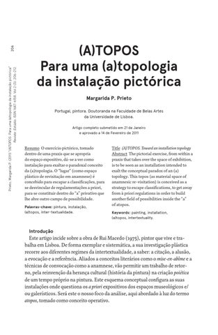 (A)TOPOS Para uma (a)topologia da instalação pictórica Margarida P. Prieto Portugal, pintora. Doutoranda na Faculdade de Belas Artes da Universidade de Lisboa. Artigo completo submetido em 21 de Janeiro e aprovado a 14 de Fevereiro de 2011