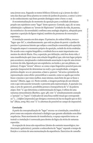 uma árvore seca. Segundo os textos bíblicos (Génesis 2:9) a árvore da vida é uma das duas que Deus plantou no centro do jardim do paraíso, a outra é a árvore do conhecimento cujo fruto permite distinguir entre o bem e o mal. A recontextualização do momento da aparição para a realidade alentejana propõe um espinheiro como “lugar” deste aparecer. Contudo, aqui, dá-se uma substituição: o plátano ou “árvore de Hipócrates” (símbolo da vida, da pureza, da resistência e da serenidade) confirma uma analogia alegórica, adequada para suportar a aparição da figura virginal, também ela promessa de renovação e esperança. A instalação assenta em dois atopos. O primeiro, de ordem bíblica, evoca o “lugar-que-foi”, e, simultaneamente, que está no plano do porvir: o jardim do paraíso é a promessa latente que subjaz a conciliação consentida pela aparição. O segundo atopos é o momento próprio da aparição, excluído da récita retabular. De acordo com o registo biográfico, o retábulo foca os mais importantes momentos da vida de Maria. Ora, a aparição, por definição, está fora desta vida, é uma manifestação após (mas com relação biográfica) que, não tem lugar próprio para acontecer, exceptuando a indeterminada associação à copa de uma árvore (a árvore da vida, figurada por um espinheiro, na lenda e, por um plátano, na pintura). O signo “árvore” oferece-se como o topos linguístico possível para esta aparição (impossível de determinar no real) e, por cumplicidade, a imagem pictórica dispõe-se a re-presentar, a fazer a-parecer: “tal seria o primitivo da representação como efeito: presentificar o ausente, como se aquilo que revém fosse o mesmo e por vezes melhor, mais intenso, mais forte do que se fosse o mesmo” (Marin, 1993: 11). Neste sentido, a imagem participa de um trânsito com o que está ausente tornando-o presente pela representação. A aparição (ou seja, o acto de aparecer), possibilita pensar a transparência do “a” da palavra atopos. Este “a”, que determina a indeterminação do lugar, é reflexo de uma natureza extraordinária (Barthes, 1977: 48); este “a” simultaneamente anexado a “parição” e a “topos” é indicador de uma força móbil visual que corresponde ao “(…) diáfano [expressão] que designa a travessia da luz ou daquilo que se dá à luz” (Maia, 2009: 80); esse “a” é a abertura do possível no campo do impossível.