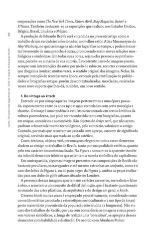 corporações como The New York Times, Editora Abril, Mag Magazine, Bravo! e F/Nasca. Também destacam-se as exposições que realizou nos Estados Unidos, Bélgica, Brasil, Lituânia e México. A produção de Eduardo Recife será entendida no presente artigo como o trabalho de um verdadeiro colecionador, ao melhor estilo Atlas Mnemosyne de Aby Warburg, no qual as imagens não têm lugar fixo no tempo, e podem transitar livremente de uma prancha à outra, promovendo assim novas relações morfológicas e simbólicas. Em todas suas obras, sejam elas pessoais ou profissionais, percebe-se a marca de sua autoria. É recorrente o uso de imagens pueris, sempre com intervenções do autor por meio de rabiscos, recortes e comentários que chegam a ironizar, muitas vezes, o sentido original das imagens. Nelas, há sempre intenção de recordar uma época, evocada pela reutilização de publicidades e fotografias antigas, porém descontextualizadas, mescladas, recicladas nesse novo suporte que lhes dá, também, um novo sentido. 1. Do vintage ao kitsch