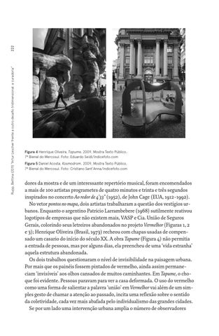 dores da mostra e de um interessante repertório musical, foram encomendados a mais de 100 artistas programetes de quatro minutos e trinta e três segundos inspirados no concerto Ao redor de 4’33” (1952), de John Cage (EUA, 1912-1992). No vetor pontos no mapa, dois artistas trabalharam a questão dos vestígios urbanos. Enquanto o argentino Patricio Larrambebere (1968) sutilmente reativou logotipos de empresas que não existem mais, VASP e Cia. União de Seguros Gerais, colorindo seus letreiros abandonados no projeto Vermelhor (Figuras 1, 2 e 3); Henrique Oliveira (Brasil, 1973) recheou com chapas usadas de compensado um casario do início do século XX. A obra Tapume (Figura 4) não permitia a entrada de pessoas, mas por alguns dias, ela preencheu de uma ‘vida estranha’ aquela estrutura abandonada. Os dois trabalhos questionaram o nível de invisibilidade na paisagem urbana. Por mais que os painéis fossem pintados de vermelho, ainda assim permaneciam ‘invisíveis’ aos olhos cansados de muitos caminhantes. Em Tapume, o choque foi evidente. Pessoas paravam para ver a casa deformada. O uso do vermelho como uma forma de salientar a palavra ‘união’ em Vermelhor vai além de um simples gesto de chamar a atenção ao passado, incita uma reflexão sobre o sentido da coletividade, cada vez mais abafada pelo individualismo das grandes cidades. Se por um lado uma intervenção urbana amplia o número de observadores