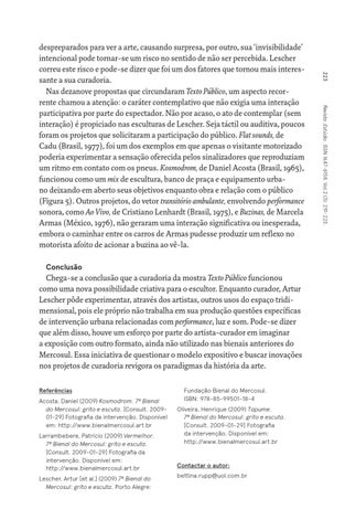 Chega-se a conclusão que a curadoria da mostra Texto Público funcionou como uma nova possibilidade criativa para o escultor. Enquanto curador, Artur Lescher pôde experimentar, através dos artistas, outros usos do espaço tridimensional, pois ele próprio não trabalha em sua produção questões específicas de intervenção urbana relacionadas com performance, luz e som. Pode-se dizer que além disso, houve um esforço por parte do artista-curador em imaginar a exposição com outro formato, ainda não utilizado nas bienais anteriores do Mercosul. Essa iniciativa de questionar o modelo expositivo e buscar inovações nos projetos de curadoria revigora os paradigmas da história da arte. Referências Acosta, Daniel (2009) Kosmodrom. 7ª Bienal do Mercosul: grito e escuta. [Consult. 200901-29] Fotografia da intervenção. Disponível em: http://www.bienalmercosul.art.br Larrambebere, Patrício (2009) Vermelhor. 7ª Bienal do Mercosul: grito e escuta. [Consult. 2009-01-29] Fotografia da intervenção. Disponível em: http://www.bienalmercosul.art.br Lescher, Artur [et al.] (2009) 7ª Bienal do Mercosul: grito e escuta. Porto Alegre: