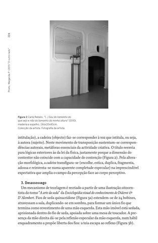 intitulação), a cadeira (objecto) faz-se corresponder à voz que intitula, ou seja, à autora (sujeito). Neste movimento de transposição sustentam-se correspondências autorais, metáforas essenciais da actividade criativa. O título reenvia para lógicas exteriores às da lei da física, justamente porque a dimensão do contentor não coincide com a capacidade de contenção (Figura 2). Pela alteração morfológica, a cadeira transfigura-se (encolhe, estica, duplica, fragmenta, adossa e reinventa-se numa aparente completude especular) na imprescindível expectativa que amplia o campo da percepção face ao corpo perceptivo. 3. Desassossego