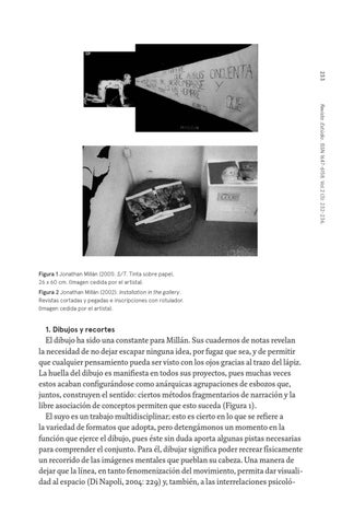 Figura 1 Jonathan Millán (2001). S/T. Tinta sobre papel, 26 x 60 cm. (Imagen cedida por el artista). Figura 2 Jonathan Millán (2002). Installation in the gallery. Revistas cortadas y pegadas e inscripciones con rotulador. (Imagen cedida por el artista).