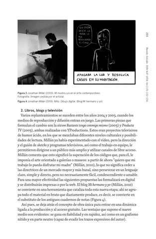 Varios replanteamientos se suceden entre los años 2004 y 2005, cuando los medios de reproducción y difusión entran en juego. Las primeras piezas que formulan el cambio son la sitcom Bastante tengo conmigo mismo (2005) y Producta TV (2005), ambas realizadas con YProductions. Estos eran proyectos televisivos de humor ácido, en los que se mezclaban diferentes niveles culturales y posibilidades de lectura. Millán ya había experimentado con el vídeo, pero la dirección y el guión de sketchs y programas televisivos, así como el trabajo en equipo, le permitieron dirigirse a un público más amplio y utilizar canales de libre acceso. Millán comenta que esto significó la superación de los códigos que, para él, le imponía el arte orientado a galerías o museos: a partir de ahora “quiero que mi trabajo lo pueda disfrutar mi madre” (Millán, 2010), lo que no significa ceder a las directrices de un mercado mayor y más banal, sino perseverar en un lenguaje claro, simple y directo, pero no necesariamente fácil, condescendiente o amable. Para una mayor efectividad las siguientes propuestas las formalizará en digital y se distribuirán impresas o por la web. El blog Mi hermano y yo (Millán, 2010) se convierte en una herramienta que cataliza toda esta nueva etapa; ahí se agrupa todo el material en bruto que diariamente produce, es decir, se convierte en el substituto de los antiguos cuadernos de notas (Figura 4). Así pues, se deja atrás el concepto de obra única para entrar en una dinámica ligada a la producción y al acceso gratuito. Las ventajas que supone el nuevo medio son evidentes: se gana en fiabilidad y en rapidez, así como en un grafismo nítido y en parte neutro (capaz de evadir los trazos expresivos del autor).