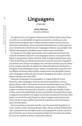 Na edição de 2011 do Congresso Internacional Criadores Sobre outras Obras consolida-se uma identidade emergente que aponta o caminho para uma dinâmica de investigação que se adequa à prática artística nas suas diversas dimensões e formulações. Será através desta identidade que se pode proporcionar o entendimento colectivo de uma “Linguagem Artística” que permitirá uma reflexão mais alargada e partilhada entre os pares nesta comunidade. O conjunto de seis artigos apresentados nesta secção representa bem esta noção de identidade subjacente a uma linguagem artística, começando desde logo por estar patente na ideia central do artigo de Eugènia Agustí Camí sobre a obra de Eloi Puig, que aborda precisamente a noção de uma meta-linguagem em paralelo com o discurso tecnológico das estruturas narrativas que um artista cria no contexto específico de Software Art. Numa disciplina não tão distante, a Fotografia, Fernanda Bulegon Gassen reflete e investiga sobre a proposta artística Tableaux de Mariana Silva da Silva estabelecendo uma identidade comum entre a linguagem estética da série de quatro fotografias em análise e traços da pintura holandesa do século XVII. Passando à Linguagem Cinematográfica, os artigos de Rita de Cássia Demarchi, sobre a linguagem visual na obra de Fernando Diniz, e de Sara Antónia Matos, sobre a intervenção da artista Fernanda Fragateiro no edifício Estação Biológica do Garducho, perspectivam a discussão e a reflexão da imagem em movimento de expressão cinemática, em diferentes funções. Ambas as obras partem da subjetividade do autor, permitindo a Fernando Dinis chegar à imagem em movimento com origem na estrutura conceptual do desenho sobre papel e no caso de Fernanda Fragateiro chegar à imagem real percepcionada como cinema no espaço público, partindo da Arquitetura como instrumento para o desenho óptico. Da mesma forma, no domínio da vídeo-arte, Fernanda Aide Seganfredo do Canto analisa a vídeo-instalação Bosque: Playa: Danza, de Javier Di Benedictis, sobre a perspectiva da convergência para uma linguagem de criação e preservação da memória, que se baseia em pequenos fragmentos de vídeos intervindos por meio de camadas de pintura e dispositivos ópticos.