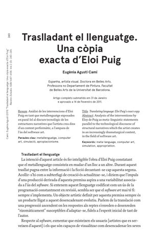 Traslladant el llenguatge. Una còpia exacta d’Eloi Puig Eugènia Agustí Camí Espanha, artista visual. Doctora en Belles Arts. Professora no Departament de Pintura. Facultat de Belles Arts de la Universitat de Barcelona. Artigo completo submetido em 31 de Janeiro e aprovado a 14 de Fevereiro de 2011.
