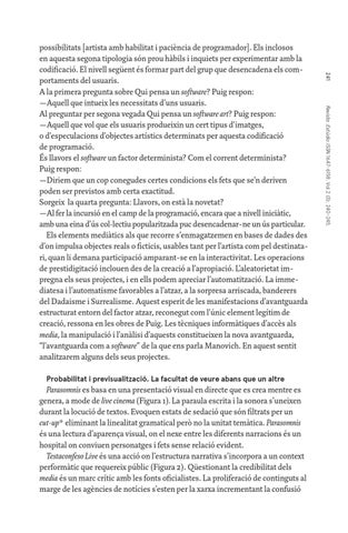 possibilitats [artista amb habilitat i paciència de programador]. Els inclosos en aquesta segona tipologia són prou hàbils i inquiets per experimentar amb la codificació. El nivell següent és formar part del grup que desencadena els comportaments del usuaris. A la primera pregunta sobre Qui pensa un software? Puig respon: —Aquell que intueix les necessitats d’uns usuaris. Al preguntar per segona vegada Qui pensa un software art? Puig respon: —Aquell que vol que els usuaris produeixin un cert tipus d’imatges, o d’especulacions d’objectes artístics determinats per aquesta codificació de programació. És llavors el software un factor determinista? Com el corrent determinista? Puig respon: —Diriem que un cop conegudes certes condicions els fets que se’n deriven poden ser previstos amb certa exactitud. Sorgeix la quarta pregunta: Llavors, on està la novetat? —Al fer la incursió en el camp de la programació, encara que a nivell iniciàtic, amb una eina d’ús col·lectiu popularitzada puc desencadenar-ne un ús particular. Els elements mediàtics als que recorre s’enmagatzemen en bases de dades des d’on impulsa objectes reals o ficticis, usables tant per l’artista com pel destinatari, quan li demana participació amparant-se en la interactivitat. Les operacions de prestidigitació inclouen des de la creació a l’apropiació. L’aleatorietat impregna els seus projectes, i en ells podem apreciar l’automatització. La immediatesa i l’automatisme favorables a l’atzar, a la sorpresa arriscada, banderers del Dadaisme i Surrealisme. Aquest esperit de les manifestacions d’avantguarda estructurat entorn del factor atzar, reconegut com l’únic element legítim de creació, ressona en les obres de Puig. Les tècniques informàtiques d’accès als media, la manipulació i l’anàlisi d’aquests constitueixen la nova avantguarda, “l’avantguarda com a software” de la que ens parla Manovich. En aquest sentit analitzarem alguns dels seus projectes.