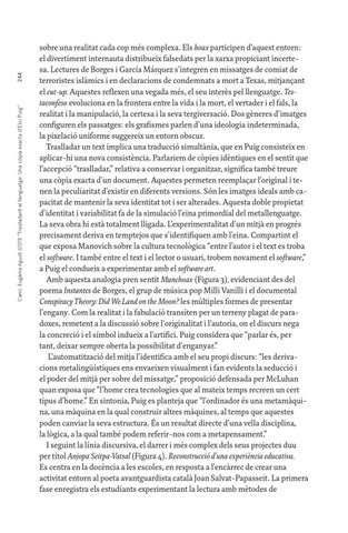 sobre una realitat cada cop més complexa. Els hoax participen d’aquest entorn: el divertiment internauta distribueix falsedats per la xarxa propiciant incertesa. Lectures de Borges i García Márquez s’integren en missatges de comiat de terroristes islàmics i en declaracions de condemnats a mort a Texas, mitjançant el cut-up. Aquestes reflexen una vegada més, el seu interès pel llenguatge. Testaconfeso evoluciona en la frontera entre la vida i la mort, el vertader i el fals, la realitat i la manipulació, la certesa i la seva tergiversació. Dos gèneres d’imatges configuren els passatges: els grafismes parlen d’una ideologia indeterminada, la pixelació uniforme suggereix un entorn obscur. Traslladar un text implica una traducció simultània, que en Puig consisteix en aplicar-hi una nova consistència. Parlariem de còpies idèntiques en el sentit que l’accepció “traslladar,” relativa a conservar i organitzar, significa també treure una còpia exacta d’un document. Aquestes permeten reemplaçar l’original i tenen la peculiaritat d’existir en diferents versions. Són les imatges ideals amb capacitat de mantenir la seva identitat tot i ser alterades. Aquesta doble propietat d’identitat i variabilitat fa de la simulació l’eina primordial del metallenguatge. La seva obra hi està totalment lligada. L’experimentalitat d’un mitjà en progrés precisament deriva en temptejos que s’identifiquen amb l’eina. Compartint el que exposa Manovich sobre la cultura tecnològica “entre l’autor i el text es troba el software. I també entre el text i el lector o usuari, trobem novament el software,” a Puig el condueix a experimentar amb el software art. Amb aquesta analogia pren sentit Munchoax (Figura 3), evidenciant des del poema Instantes de Borges, el grup de música pop Milli Vanilli i el documental Conspiracy Theory: Did We Land on the Moon? les múltiples formes de presentar l'engany. Com la realitat i la fabulació transiten per un terreny plagat de paradoxes, remetent a la discussió sobre l'originalitat i l'autoria, on el discurs nega la concreció i el símbol indueix a l’artifici. Puig considera que “parlar és, per tant, deixar sempre oberta la possibilitat d'enganyar.” L’automatització del mitja l’identifica amb el seu propi discurs: “les derivacions metalingüístiques ens envaeixen visualment i fan evidents la seducció i el poder del mitjà per sobre del missatge,” proposició defensada per McLuhan quan exposa que “l’home crea tecnologies que al mateix temps recreen un cert tipus d’home.” En sintonia, Puig es planteja que “l’ordinador és una metamàquina, una màquina en la qual construir altres màquines, al temps que aquestes poden canviar la seva estructura. És un resultat directe d’una vella disciplina, la lògica, a la qual també podem referir-nos com a metapensament.” I seguint la línia discursiva, el darrer i més complex dels seus projectes duu per títol Anjopa Seitpa-Vatsal (Figura 4). Reconstrucció d’una experiència educativa. Es centra en la docència a les escoles, en resposta a l’encàrrec de crear una activitat entorn al poeta avantguardista català Joan Salvat-Papasseit. La primera fase enregistra els estudiants experimentant la lectura amb mètodes de