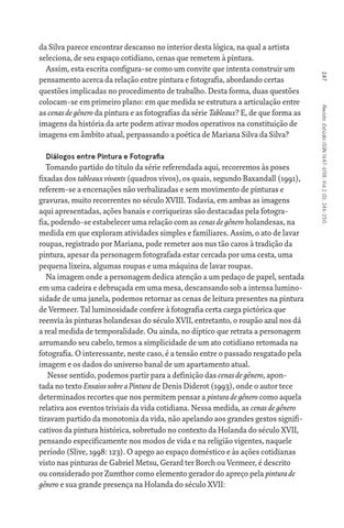 da Silva parece encontrar descanso no interior desta lógica, na qual a artista seleciona, de seu espaço cotidiano, cenas que remetem à pintura. Assim, esta escrita configura-se como um convite que intenta construir um pensamento acerca da relação entre pintura e fotografia, abordando certas questões implicadas no procedimento de trabalho. Desta forma, duas questões colocam-se em primeiro plano: em que medida se estrutura a articulação entre as cenas de gênero da pintura e as fotografias da série Tableaux? E, de que forma as imagens da história da arte podem ativar modos operativos na constituição de imagens em âmbito atual, perpassando a poética de Mariana Silva da Silva?