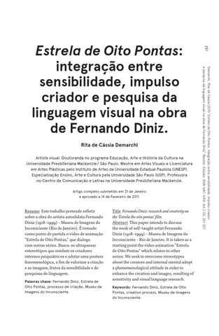Title Fernando Diniz: research and creativity on the ‘Estrela the oito pontas’ film. Abstract This paper intends to discuss the work of self-taught artist Fernando Diniz (1918-1999) - Museu de Imagens do Inconsciente - Rio de Janeiro. It is taken as a starting point the video animation "Estrela de Oito Pontas" which relates to other series. We seek to overcome stereotypes about the creators and internal mental adopt a phenomenological attitude in order to enhance the creation and images, resulting of sensitivity and visual language research. Keywords: Fernando Diniz, Estrela de Oito Pontas, creation process, Museu de Imagens do Inconsciente.