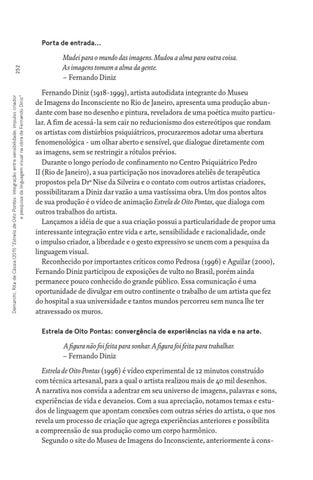 Mudei para o mundo das imagens. Mudou a alma para outra coisa. As imagens tomam a alma da gente. – Fernando Diniz Fernando Diniz (1918-1999), artista autodidata integrante do Museu de Imagens do Inconsciente no Rio de Janeiro, apresenta uma produção abundante com base no desenho e pintura, reveladora de uma poética muito particular. A fim de acessá-la sem cair no reducionismo dos estereótipos que rondam os artistas com distúrbios psiquiátricos, procuraremos adotar uma abertura fenomenológica - um olhar aberto e sensível, que dialogue diretamente com as imagens, sem se restringir a rótulos prévios. Durante o longo período de confinamento no Centro Psiquiátrico Pedro II (Rio de Janeiro), a sua participação nos inovadores ateliês de terapêutica propostos pela Drª Nise da Silveira e o contato com outros artistas criadores, possibilitaram a Diniz dar vazão a uma vastíssima obra. Um dos pontos altos de sua produção é o vídeo de animação Estrela de Oito Pontas, que dialoga com outros trabalhos do artista. Lançamos a idéia de que a sua criação possui a particularidade de propor uma interessante integração entre vida e arte, sensibilidade e racionalidade, onde o impulso criador, a liberdade e o gesto expressivo se unem com a pesquisa da linguagem visual. Reconhecido por importantes críticos como Pedrosa (1996) e Aguilar (2000), Fernando Diniz participou de exposições de vulto no Brasil, porém ainda permanece pouco conhecido do grande público. Essa comunicação é uma oportunidade de divulgar em outro continente o trabalho de um artista que fez do hospital a sua universidade e tantos mundos percorreu sem nunca lhe ter atravessado os muros. Estrela de Oito Pontas: convergência de experiências na vida e na arte.
