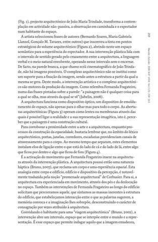 (Fig. 1), projecto arquitectónico de João Maria Trindade, transforma a contemplação em actividade não-passiva, a observação em caminhada e o espectador num habitante do espaço. A artista seleccionou frases de autores (Bernardo Soares, Maria Gabriela Llansol, Gonçalo M. Tavares, entre outros) que inscreveu a tinta em pontos estratégicos do volume arquitectónico (Figura 2), abrindo neste um espaço semântico para a experiência do espectador. A sua intervenção plástica lida com o intervalo de sentido gerado pelo cruzamento entre a arquitectura, a linguagem verbal e o meio natural envolvente, operando nesse intervalo sem o encerrar. De facto, na parede branca, a que chamo ecrã cinematográfico de João Trindade, não há imagens possíveis. O complexo arquitectónico não se institui como um suporte para a fixação da imagem, sendo antes a estrutura a partir da qual a mesma se gera. Deste modo, a intervenção artística e o complexo arquitectónico são motores da produção da imagem. Como relembra Fernanda Fragateiro, numa das frases pintadas sobre a parede: “a paisagem não é qualquer coisa para a qual se olha, mas através da qual se vê”(Jubelin, 2006). A arquitectura funciona como dispositivo óptico, um dispositivo de emolduramento do espaço, não apenas para o olhar mas para todo o corpo. As aberturas arquitectónicas (Figura 3) operam como lentes ou membranas através das quais é possível ligar a realidade e a sua representação imagética, isto é, perceber que a paisagem é uma construção cultural. Para corroborar a proximidade entre a arte e a arquitectura, enquanto processos da construção da espacialidade, bastaria lembrar que, no âmbito do léxico arquitectónico, portas, janelas, corredores, escadarias providenciam canais de atravessamento para o corpo. Ao mesmo tempo que separam, estes elementos instalam elos de ligação entre o que está do lado de cá e do lado de lá, entre algo que ficou por dentro e algo que ficou de fora (Figura 4). É a activação do movimento que Fernanda Fragateiro insere na arquitectura através da intervenção plástica. A arquitectura possui então uma natureza háptica (Bruno, 2007), que reclama um corpo e uma experiência espacial. Esta analogia entre corpo e edifício, edifício e dispositivo da percepção, é notavelmente traduzida pela noção “promenade arquitectural” de Corbusier. Para si, a arquitectura era experienciada em movimento, através dos pés e da deslocação no espaço. Também as intervenções de Fernanda Fragateiro ao longo do edifício solicitam que percorramos aquele, que sintamos as massas inerentes à estrutura do edifício, que estabeleçamos interacção entre o que as palavras sugerem, a memória convoca e a imaginação lhes sobrepõe, desconstruindo o carácter de consagração por vezes atribuído à arquitectura. Convidando o habitante para uma “viagem arquitectónica” (Bruno, 2002), a intervenção abre um intervalo, espaço que se interpõe entre o mundo e a representação. É esse espaço que permite indagar aquilo que a imagem emudeceu,
