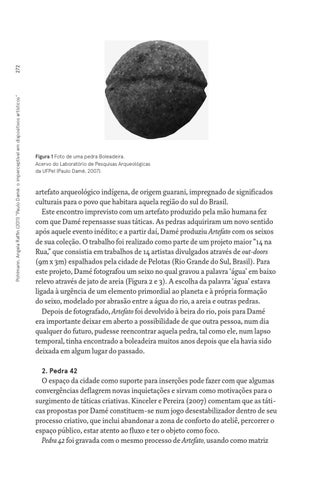 artefato arqueológico indígena, de origem guarani, impregnado de significados culturais para o povo que habitara aquela região do sul do Brasil. Este encontro imprevisto com um artefato produzido pela mão humana fez com que Damé repensasse suas táticas. As pedras adquiriram um novo sentido após aquele evento inédito; e a partir daí, Damé produziu Artefato com os seixos de sua coleção. O trabalho foi realizado como parte de um projeto maior “14 na Rua,” que consistia em trabalhos de 14 artistas divulgados através de out-doors (9m x 3m) espalhados pela cidade de Pelotas (Rio Grande do Sul, Brasil). Para este projeto, Damé fotografou um seixo no qual gravou a palavra ‘água’ em baixo relevo através de jato de areia (Figura 2 e 3). A escolha da palavra ‘água’ estava ligada à urgência de um elemento primordial ao planeta e à própria formação do seixo, modelado por abrasão entre a água do rio, a areia e outras pedras. Depois de fotografado, Artefato foi devolvido à beira do rio, pois para Damé era importante deixar em aberto a possibilidade de que outra pessoa, num dia qualquer do futuro, pudesse reencontrar aquela pedra, tal como ele, num lapso temporal, tinha encontrado a boleadeira muitos anos depois que ela havia sido deixada em algum lugar do passado. 2. Pedra 42