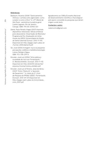 Referências Basbaum, Ricardo (2008) “Deslocamentos rítmicos: o artista como agenciador, como curador e como crítico” In: 27ª. Bienal de São Paulo : seminários/curadoria geral Lisette Lagnado. Rio de Janeiro: Cobogó. ISBN: 978-85-60965-021 Damé, Paulo Renato Viegas (2007) Inserindo dispositivos relacionais: táticas artísticas para desacelerar. Dissertação de Mestrado/ Programa de Pós-Graduação em Artes Visuais da UDESC (Universidade do Estado de Santa Catarina) [Consut. 2010-11-09] Disponível em http://ppgav.ceart.udesc.br /turma1_2005/dame/A.pdf Gil, José (2005) A imagem-nua e as pequenas percepções: estética e metafenomenologia. Lisboa: Relógio d’água. ISBN: 972-708-299-8 Kinceler, José Luiz (2006) “Arte pública e sociedade de risco em Florianópolis.” In: Revista Artefato. [Consult. 2010-11-10] Disponível em http://arte100.net/portal/ arquivos/rizoma/rizoma_artefato.pdf Kinceler, José Luiz & Pereira, Janaí de Abreu (2007) “Entre ‘Pedra 42’ e ‘Aprendiz de Passarinho’.” In: Anais do 2º. Ciclo de Pesquisa do PPGAV-UDESC. Florianópolis. [Consult. 2010-09-07] Disponível em http://ppgav.ceart.udesc.br/ciclo2/anais_ ciclo_2007.pdf