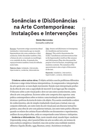 Marcondes, Neide (2011) “Sonâncias e (Dis)Sonâncias na Arte Contemporânea: Instalações e Intervenções” Revista :Estúdio. ISSN: 1647-6158. Vol.2 (3): 27-32.