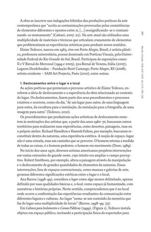 As ações poéticas que permeiam o percurso artístico de Elaine Tedesco, envolvem a ideia de deslocamento e a experiência da obra relacionada ao contexto do lugar. Os deslocamentos, fazem parte dos seus procedimentos e processos criativos e ocorrem, como ela diz, “de um lugar para outro, de uma linguagem para outra, da escultura para a instalação, da instalação para a fotografia, de uma imagem para outra” (Tedesco, 2010). Os procedimentos que produziram ações artísticas de deslocamento remetem às motivações dos artistas que, a partir dos anos 1960-70, buscaram outros territórios para realizarem suas experiências, como desertos, paisagens, ruas ou o próprio atelier. Richard Hamilton e Hamish Fulton, por exemplo, buscaram reconstituir dentro da natureza, uma experiência estética. A noção de espaço-lugar não é uma estrada, mas um caminho que se percorre. O homem retoma a medida de todas as coisas, é o homem pedestre, o homem em movimento (Duve, 1989). No início dos anos 1970, diversos artistas americanos propõem intervenções em vastas extensões do grande oeste, cujo intuito era ampliar o campo perceptivo. Robert Smithson, por exemplo, altera a paisagem através da manipulação e o deslocamento de grandes quantidades de elementos da natureza. Essas intervenções, fora de espaços convencionais, como museus e galerias de arte, geraram diferentes significações estéticas entre o lugar e o local. Ana Barros (1998-99), considera o lugar como algo menos delimitado, apenas definido por suas qualidades básicas e, o local, como espaço já humanizado, com narrativas e histórias próprias. Neste sentido, compreendemos que é no local onde ocorre a confrontação das experiências resultantes da comunicação entre diferentes lugares e culturas. Ao lugar “soma-se um conteúdo da memória que faz do lugar uma multiplicidade de locais” (Barros, 1998-99: 33). Em Cabines para Isolamento e Camas Públicas (1999), (Figura 1), Tedesco instala objetos em espaço público, incitando a participação fisica do espectador para
