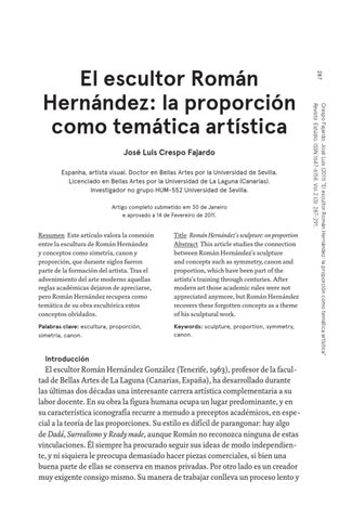 Title Román Hernández’s sculpture: on proportion Abstract This article studies the connection between Román Hernández’s sculpture and concepts such as symmetry, canon and proportion, which have been part of the artists’s training through centuries. After modern art those academic rules were not appreciated anymore, but Román Hernández recovers these forgotten concepts as a theme of his sculptural work.