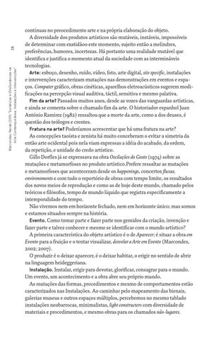 contínuas no preocedimento arte e na própria elaboração do objeto. A diversidade dos produtos artísticos são mutáveis, instáveis, impossíveis de determinar com exatidãoo este momento, sujeito então a melindres, preferências, humores, incertezas. Há portanto uma realidade mutável que identifica e justifica o momento atual da sociedade com as intermináveis tecnologias. Arte: esboço, desenho, ruído, vídeo, foto, arte digital, site specific, instalações e intervenções caracterizam mutações nas demonstrações em eventos e espaços. Computer gráfico, obras cinéticas, aparelhos eletroacústicos sugerem modificações na percepção visual auditiva, táctil, sensitiva e mesmo palativa. Fim da arte? Passados muitos anos, desde as vozes das vanguardas artísticas, e ainda se comenta sobre o chamado fim da arte. O historiador espanhol Juan António Ramirez (1982) ressaltou que a morte da arte, como a dos deuses, é questão dos teólogos e crentes. Fratura na arte? Poderíamos acrescentar que há uma fratura na arte? As concepções taoísta e zenista há muito conceberam o evitar a simetria da então arte ocidental pois nela viam expressas a idéia do acabado, da ordem, da repetição, e unidade do credo artístico. Gillo Dorfles já se expressava na obra Oscilações do Gosto (1974) sobre as mutações e metamorfoses no produto artístico.Prefere ressaltar as mutações e metamorfoses que aconteceram desde os happenings, concertos fluxus, environoments e com todo o repertório de obras com tempo limite, os resultados dos novos meios de reprodução e como as de hoje deste mundo, chamado pelos teóricos e filósofos, tempo de mundo líquido que registra especificamente a intemporalidade do tempo. Não vivemos nem em horizonte fechado, nem em horizonte único; mas somos e estamos situados sempre na história. Evento. Como tomar parte e fazer parte nos gemidos da criação, invenção e fazer parte e talvez conhecer e mesmo se identificar com o mundo artístico? A primeira característica do objeto artístico é o de Aparecer; é situar a obra em Evento para a fruição e o tentar visualizar, desvelar a Arte em Evento (Marcondes, 2002; 2007). O produzir é o deixar aparecer, é o deixar habitar, o erigir no sentido de abrir na linguagem heideggeriana. Instalação. Instalar, erigir para devotar, glorificar, consagrar para o mundo. Um evento, um acontecimento e a obra abre seu próprio mundo. As mutações das formas, procedimentos e mesmo de comportamentos estão caracterizados nas Instalações. Ao caminhar pelo mapeamento das bienais, galerias museus e outros espaços múltiplos, percebemos no mesmo tablado instalações neobarrocas, minimalistas, light constructers com diversidade de materiais e procedimentos, e mesmo obras para os chamados não-lugares.