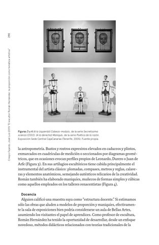 la antropometría. Bustos y rostros expresivos elevados en caduceos y plintos, enmarcados en cuadrículas de medición o seccionados por diagramas geométricos, que en ocasiones evocan perfiles propios de Leonardo, Durero o Juan de Arfe (Figura 3). En sus artilugios escultóricos tiene cabida principalmente el instrumental del artista clásico: plomadas, compases, metros y reglas, calaveras y elementos anatómicos, semejando auténticos relicarios de la creatividad. Román también ha elaborado maniquíes, muñecos de formas simples y cúbicas como aquellos empleados en los talleres renacentistas (Figura 4). Docencia