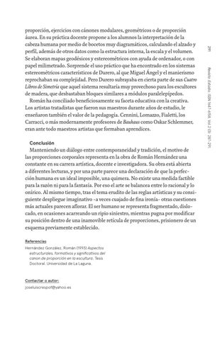 proporción, ejercicios con cánones modulares, geométricos o de proporción áurea. En su práctica docente propone a los alumnos la interpretación de la cabeza humana por medio de bocetos muy diagramáticos, calculando el alzado y perfil, además de otros datos como la estructura interna, la escala y el volumen. Se elaboran mapas geodésicos y estereométricos con ayuda de ordenador, o con papel milimetrado. Sorprende el uso práctico que ha encontrado en los sistemas estereométricos característicos de Durero, al que Miguel Ángel y el manierismo reprochaban su complejidad. Pero Durero subrayaba en cierta parte de sus Cuatro Libros de Simetría que aquel sistema resultaría muy provechoso para los escultores de madera, que desbastaban bloques similares a módulos paralelepípedos. Román ha conciliado beneficiosamente su faceta educativa con la creativa. Los artistas tratadistas que fueron sus maestros durante años de estudio, le enseñaron también el valor de la pedagogía. Cennini, Lomazzo, Fialetti, los Carracci, o más modernamente profesores de Bauhaus como Oskar Schlemmer, eran ante todo maestros artistas que formaban aprendices.