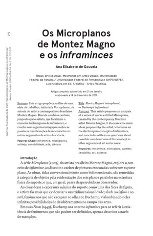 Title Montez Magno’s ‘microplanos’: on Duchamp’s ‘inframinces’ Abstract This article proposes an analysis of a series of works entitled Microplans, created by the contemporary Brazilian artist Montez Magno. It discusses the main ideas proposed by the artist, who focus on the duchampian concepts of inframince, and concludes with some questions about possible reverberations of that concept in other segments of art and science. Keywords: inframince, microplans, subtlety sensibility, art, science.