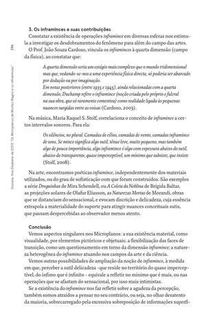 Constatar a existência de operações inframince em diversas esferas nos estimula a investigar os desdobramentos do fenômeno para além do campo das artes. O Prof. João Souza Cardoso, vincula os inframinces à quarta dimensão (campo da física), ao constatar que: A quarta dimensão seria um estágio mais complexo que o mundo tridimensional mas que, vedando-se-nos a uma experiência física directa, só poderia ser abarcado por dedução ou por imaginação. Em notas posteriores (entre 1935 e 1945), ainda relacionadas com a quarta dimensão, Duchamp refere o inframince (noção criada pelo próprio e fulcral na sua obra, que só raramente comentou) como realidade ligada às pequenas nuances surgidas entre as coisas (Cardoso, 2003). Na música, Maria Raquel S. Stolf, correlaciona o conceito de inframince a certos intervalos sonoros. Para ela: Os silêncios, no plural. Camadas de cílios, camadas de vento, camadas inframince de sons, Se mince significa algo sutil, tênue leve, muito pequeno, mas também algo de pouca importância, algo inframince é algo com espessura abaixo do sutil, abaixo do transparente, quase imperceptível, um mínimo que subsiste, que insiste (Stolf, 2008). Na arte, encontramos poéticas inframince, independentemente dos materiais utilizados, ou do grau de sofisticação com que foram construídos. São exemplos a série Droguinhas de Mira Schendell, ou A Coleta da Neblina de Brígida Baltar, as projeções solares de Olafur Eliasson, as Naturezas Mortas de Morandi, obras que se distanciam do sensacional, e evocam discrição e delicadeza, cuja essência extrapola a materialidade do suporte para atingir nuances conceituais sutis, que passam despercebidas ao observador menos atento. Conclusão