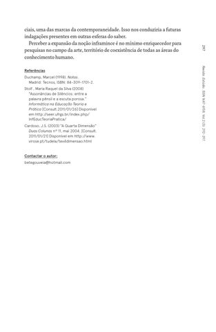 Duchamp, Marcel (1998). Notas. Madrid: Tecnos, ISBN: 84-309-1701-2. Stolf , Maria Raquel da Silva (2008) “Assonâncias de Silêncios: entre a palavra pênsil e a escuta porosa.” Informática na Educação Teoria e Prática [Consult.2011/01/26] Disponivel em http://seer.ufrgs.br/index.php/ InfEducTeoriaPratica/ Cardoso, J.S. (2003) “A Quarta Dimensão” Duas Colunas nº 11, mai 2004. [Consult. 2011/01/21] Disponível em http://www. virose.pt/tudela/tex4dimensao.html