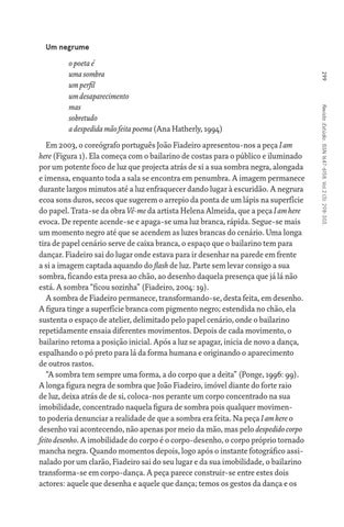 Em 2003, o coreógrafo português João Fiadeiro apresentou-nos a peça I am here (Figura 1). Ela começa com o bailarino de costas para o público e iluminado por um potente foco de luz que projecta atrás de si a sua sombra negra, alongada e imensa, enquanto toda a sala se encontra em penumbra. A imagem permanece durante largos minutos até a luz enfraquecer dando lugar à escuridão. A negrura ecoa sons duros, secos que sugerem o arrepio da ponta de um lápis na superfície do papel. Trata-se da obra Vê-me da artista Helena Almeida, que a peça I am here evoca. De repente acende-se e apaga-se uma luz branca, rápida. Segue-se mais um momento negro até que se acendem as luzes brancas do cenário. Uma longa tira de papel cenário serve de caixa branca, o espaço que o bailarino tem para dançar. Fiadeiro sai do lugar onde estava para ir desenhar na parede em frente a si a imagem captada aquando do flash de luz. Parte sem levar consigo a sua sombra, ficando esta presa ao chão, ao desenho daquela presença que já lá não está. A sombra “ficou sozinha” (Fiadeiro, 2004: 19). A sombra de Fiadeiro permanece, transformando-se, desta feita, em desenho. A figura tinge a superfície branca com pigmento negro; estendida no chão, ela sustenta o espaço de atelier, delimitado pelo papel cenário, onde o bailarino repetidamente ensaia diferentes movimentos. Depois de cada movimento, o bailarino retoma a posição inicial. Após a luz se apagar, inicia de novo a dança, espalhando o pó preto para lá da forma humana e originando o aparecimento de outros rastos. “A sombra tem sempre uma forma, a do corpo que a deita” (Ponge, 1996: 99). A longa figura negra de sombra que João Fiadeiro, imóvel diante do forte raio de luz, deixa atrás de de si, coloca-nos perante um corpo concentrado na sua imobilidade, concentrado naquela figura de sombra pois qualquer movimento poderia denunciar a realidade de que a sombra era feita. Na peça I am here o desenho vai acontecendo, não apenas por meio da mão, mas pelo despedido corpo feito desenho. A imobilidade do corpo é o corpo-desenho, o corpo próprio tornado mancha negra. Quando momentos depois, logo após o instante fotográfico assinalado por um clarão, Fiadeiro sai do seu lugar e da sua imobilidade, o bailarino transforma-se em corpo-dança. A peça parece construir-se entre estes dois actores: aquele que desenha e aquele que dança; temos os gestos da dança e os