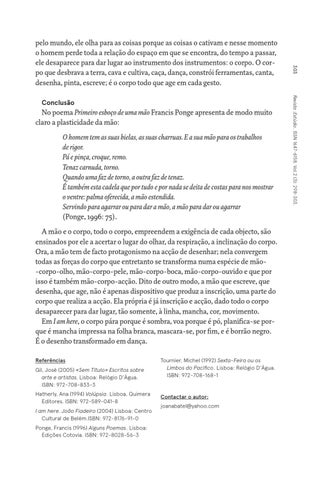 No poema Primeiro esboço de uma mão Francis Ponge apresenta de modo muito claro a plasticidade da mão: O homem tem as suas bielas, as suas charruas. E a sua mão para os trabalhos de rigor. Pá e pinça, croque, remo. Tenaz carnuda, torno. Quando uma faz de torno, a outra faz de tenaz. É também esta cadela que por tudo e por nada se deita de costas para nos mostrar o ventre: palma oferecida, a mão estendida. Servindo para agarrar ou para dar a mão, a mão para dar ou agarrar (Ponge, 1996: 75). A mão e o corpo, todo o corpo, empreendem a exigência de cada objecto, são ensinados por ele a acertar o lugar do olhar, da respiração, a inclinação do corpo. Ora, a mão tem de facto protagonismo na acção de desenhar; nela convergem todas as forças do corpo que entretanto se transforma numa espécie de mão-corpo-olho, mão-corpo-pele, mão-corpo-boca, mão-corpo-ouvido e que por isso é também mão-corpo-acção. Dito de outro modo, a mão que escreve, que desenha, que age, não é apenas dispositivo que produz a inscrição, uma parte do corpo que realiza a acção. Ela própria é já inscrição e acção, dado todo o corpo desaparecer para dar lugar, tão somente, à linha, mancha, cor, movimento. Em I am here, o corpo pára porque é sombra, voa porque é pó, planifica-se porque é mancha impressa na folha branca, mascara-se, por fim, e é borrão negro. É o desenho transformado em dança. Referências Gil, José (2005) «Sem Título» Escritos sobre arte e artistas. Lisboa: Relógio D’Água. ISBN: 972-708-833-3 Hatherly, Ana (1994) Volúpsia. Lisboa, Quimera Editores. ISBN: 972-589-041-8 I am here. João Fiadeiro (2004) Lisboa: Centro Cultural de Belém.ISBN: 972-8176-91-0 Ponge, Francis (1996) Alguns Poemas. Lisboa: Edições Cotovia. ISBN: 972-8028-56-3