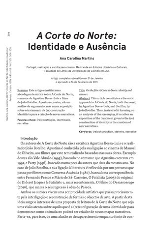 Title On the film A Corte do Norte: identity and absence Abstract This article constitutes a thematic approach to A Corte do Norte, both the novel, by Agustina Bessa-Luís, and the film, by João Botelho. Thus, instead of it focusing on an analysis of the screenplay, it is rather an exposition of the treatment given to the (re) construction of identity in the creation of new narratives. Keywords: (re)construction, identity, narrative