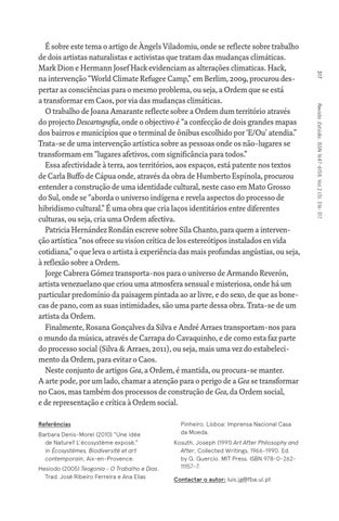 É sobre este tema o artigo de Àngels Viladomiu, onde se reflecte sobre trabalho de dois artistas naturalistas e activistas que tratam das mudanças climáticas. Mark Dion e Hermann Josef Hack evidenciam as alterações climaticas. Hack, na intervenção “World Climate Refugee Camp,” em Berlim, 2009, procurou despertar as consciências para o mesmo problema, ou seja, a Ordem que se está a transformar em Caos, por via das mudanças climáticas. O trabalho de Joana Amarante reflecte sobre a Ordem dum território através do projecto Descartografia, onde o objectivo é “a confecção de dois grandes mapas dos bairros e municípios que o terminal de ônibus escolhido por ‘E/Ou’ atendia.” Trata-se de uma intervenção artística sobre as pessoas onde os não-lugares se transformam em “lugares afetivos, com significância para todos.” Essa afectividade à terra, aos territórios, aos espaços, está patente nos textos de Carla Buffo de Cápua onde, através da obra de Humberto Espínola, procurou entender a construção de uma identidade cultural, neste caso em Mato Grosso do Sul, onde se “aborda o universo indígena e revela aspectos do processo de hibridismo cultural.” É uma obra que cria laços identitários entre diferentes culturas, ou seja, cria uma Ordem afectiva. Patricia Hernández Rondán escreve sobre Sila Chanto, para quem a intervenção artística “nos ofrece su visíon crítica de los estereótipos instalados en vida cotidiana,” o que leva o artista à experiência das mais profundas angústias, ou seja, à reflexão sobre a Ordem. Jorge Cabrera Gómez transporta-nos para o universo de Armando Reverón, artista venezuelano que criou uma atmosfera sensual e misteriosa, onde há um particular predomínio da paisagem pintada ao ar livre, e do sexo, de que as bonecas de pano, com as suas intimidades, são uma parte dessa obra. Trata-se de um artista da Ordem. Finalmente, Rosana Gonçalves da Silva e André Arraes transportam-nos para o mundo da música, através de Carrapa do Cavaquinho, e de como esta faz parte do processo social (Silva & Arraes, 2011), ou seja, mais uma vez do estabelecimento da Ordem, para evitar o Caos. Neste conjunto de artigos Gea, a Ordem, é mantida, ou procura-se manter. A arte pode, por um lado, chamar a atenção para o perigo de a Gea se transformar no Caos, mas também dos processos de construção de Gea, da Ordem social, e de representação e crítica à Ordem social.