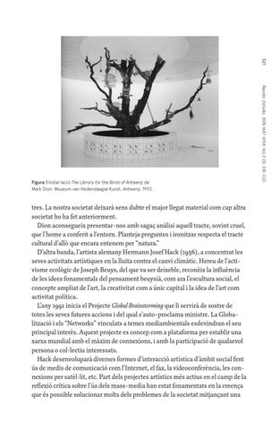 tres. La nostra societat deixarà sens dubte el major llegat material com cap altra societat ho ha fet anteriorment. Dion aconsegueix presentar-nos amb sagaç anàlisi aquell tracte, sovint cruel, que l’home a conferit a l’entorn. Planteja preguntes i ironitzar respecta el tracte cultural d’allò que encara entenem per “natura.” D’altra banda, l’artista alemany Hermann Josef Hack (1956), a concentrat les seves activitats artístiques en la lluita contra el canvi climàtic. Hereu de l’activisme ecològic de Joseph Beuys, del que va ser deixeble, reconèix la influència de les idees fonamentals del pensament beuysià, com ara l’escultura social, el concepte ampliat de l’art, la creativitat com a únic capital i la idea de l’art com activitat política. L’any 1991 inicia el Projecte Global Brainstorming que li servirà de sostre de totes les seves futures accions i del qual s’auto-proclama ministre. La Globalització i els “Networks” vinculats a temes mediambientals esdevindran el seu principal interès. Aquest projecte es concep com a plataforma per establir una xarxa mundial amb el màxim de connexions, i amb la participació de qualsevol persona o col·lectiu interessats. Hack desenvoluparà diverses formes d’interacció artística d’àmbit social fent ús de medis de comunicació com l’Internet, el fax, la videoconferència, les connexions per satèl·lit, etc. Part dels projectes artístics més actius en el camp de la reflexió crítica sobre l’ús dels mass-media han estat fonamentats en la creença que és possible solucionar molts dels problemes de la societat mitjançant una