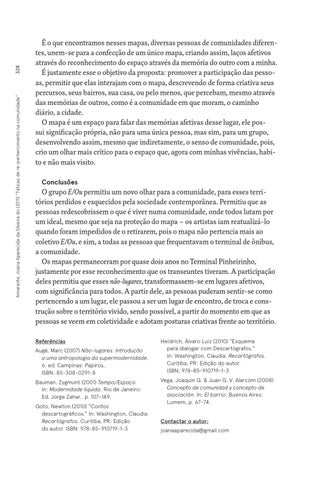 O grupo E/Ou permitiu um novo olhar para a comunidade, para esses territórios perdidos e esquecidos pela sociedade contemporânea. Permitiu que as pessoas redescobrissem o que é viver numa comunidade, onde todos lutam por um ideal, mesmo que seja na proteção do mapa – os artistas iam reatualizá-lo quando foram impedidos de o retirarem, pois o mapa não pertencia mais ao coletivo E/Ou, e sim, a todas as pessoas que frequentavam o terminal de ônibus, a comunidade. Os mapas permaneceram por quase dois anos no Terminal Pinheirinho, justamente por esse reconhecimento que os transeuntes tiveram. A participação deles permitiu que esses não-lugares, transformassem-se em lugares afetivos, com significância para todos. A partir dele, as pessoas puderam sentir-se como pertencendo a um lugar, ele passou a ser um lugar de encontro, de troca e construção sobre o território vivido, sendo possível, a partir do momento em que as pessoas se veem em coletividade e adotam posturas criativas frente ao território. Referências Augé, Marc (2007) Não-lugares: Introdução a uma antropologia da supermodernidade. 6. ed. Campinas: Papiros,. ISBN: 85-308-0291-8 Bauman, Zygmunt (2001) Tempo/Espaço. In: Modernidade liquida. Rio de Janeiro: Ed. Jorge Zahar,. p. 107-149. Goto, Newton (2010) “Contos descartográficos.” In: Washington, Claudia. Recartógrafos. Curitiba, PR: Edição do autor. ISBN: 978-85-910719-1-3