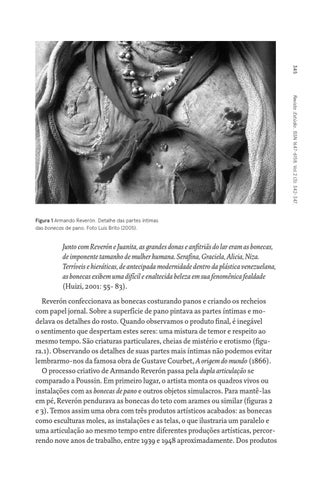 Junto com Reverón e Juanita, as grandes donas e anfitriãs do lar eram as bonecas, de imponente tamanho de mulher humana. Serafina, Graciela, Alicia, Niza. Terríveis e hieráticas, de antecipada modernidade dentro da plástica venezuelana, as bonecas exibem uma difícil e enaltecida beleza em sua fenomênica fealdade (Huizi, 2001: 55- 83). Reverón confeccionava as bonecas costurando panos e criando os recheios com papel jornal. Sobre a superfície de pano pintava as partes íntimas e modelava os detalhes do rosto. Quando observamos o produto final, é inegável o sentimento que despertam estes seres: uma mistura de temor e respeito ao mesmo tempo. São criaturas particulares, cheias de mistério e erotismo (figura.1). Observando os detalhes de suas partes mais íntimas não podemos evitar lembrarmo-nos da famosa obra de Gustave Courbet, A origem do mundo (1866). O processo criativo de Armando Reverón passa pela dupla articulação se comparado a Poussin. Em primeiro lugar, o artista monta os quadros vivos ou instalações com as bonecas de pano e outros objetos simulacros. Para mantê-las em pé, Reverón pendurava as bonecas do teto com arames ou similar (figuras 2 e 3). Temos assim uma obra com três produtos artísticos acabados: as bonecas como esculturas moles, as instalações e as telas, o que ilustraria um paralelo e uma articulação ao mesmo tempo entre diferentes produções artísticas, percorrendo nove anos de trabalho, entre 1939 e 1948 aproximadamente. Dos produtos