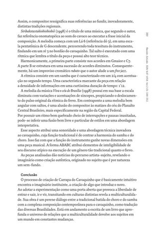 Assim, o compositor ressignifica suas referências ao fundir, inovadoramente, distintas tradições regionais. Siribakstaxtakiobiobiobiô (1998) é o título de uma música, que segundo o autor, faz referência onomatopéica ao som do cavaco ao executar a frase inicial da composição. A melodia começa com um Lá 6 (referência dó 3), em uma escala pentatônica de G descendente, percorrendo toda tessitura do instrumento, findando em um ré 3 no bordão do cavaquinho. Tal salto é executado com uma rítmica que lembra o título da peça e possui alto teor técnico. Harmonicamente, a primeira parte consiste nos acordes em Gmaior e C7. A parte B se estrutura em uma sucessão de acordes diminutos. Consequentemente, há um improviso cromático rubato que o autor alude a um free jazz. A rítmica consiste em um samba que é caracterizado em um 2/4 com acentuação no segundo tempo. Uma característica marcante da peça em relação a densidade de informações em uma curtíssima duração de tempo: 1’12. A melodia da música Viva o céu de Brasília (1998) possui em sua base a escala diminuta com variações e acentuações de síncopes, propiciando o deslocamento do pulso original da rítmica do frevo. Em contraponto a uma melodia bem angular com saltos, é uma alusão do compositor às matizes do céu do Planalto Central Brasileiro, mais especificamente na região da Capital Federal. Por possuir um ritmo bem quebrado cheio de interrupções e pausas inusitadas, pode-se inferir uma fusão bem livre e particular de estilos em uma abordagem interpretativa. Esse aspecto atribui uma sonoridade e uma abordagem técnica inovadora ao cavaquinho, cuja função tradicional é de centrar a harmonia do samba e do choro. Isso faz com que a função do instrumento ganhe novas dimensões em uma peça musical. A forma ABABC atribui elementos de inteligibilidade de seu discurso atípico na execução de um gênero tão tradicional quanto o frevo. As peças analisadas dão notícias do percurso artista-sujeito, revelando o imaginário como criação autêntica, originado no sujeito que é por natureza um sem-fundo.