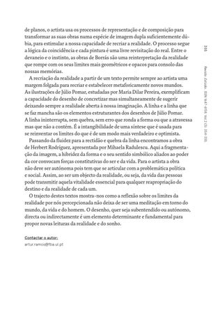 de planos, o artista usa os processos de representação e de composição para transformar as suas obras numa espécie de imagem dupla suficientemente dúbia, para estimular a nossa capacidade de recriar a realidade. O processo segue a lógica da coincidência e cada pintura é uma livre revisitação do real. Entre o devaneio e o instinto, as obras de Borrás são uma reinterpretação da realidade que rompe com os seus limites mais geométricos e opacos para consolo das nossas memórias. A recriação da realidade a partir de um texto permite sempre ao artista uma margem folgada para recriar e estabelecer metaforicamente novos mundos. As ilustrações de Júlio Pomar, estudadas por Maria Dilar Pereira, exemplificam a capacidade do desenho de concretizar mas simultaneamente de sugerir deixando sempre a realidade aberta à nossa imaginação. A linha e a linha que se faz mancha são os elementos estruturantes dos desenhos de Júlio Pomar. A linha ininterrupta, sem quebra, sem erro que ronda a forma ou que a atravessa mas que não a contém. É a intangibilidade de uma síntese que é usada para se reinventar os limites do que é de um modo mais verdadeiro e optimista. Passando da fluidez para a rectidão e quebra da linha encontramos a obra de Herbert Rodríguez, apresentada por Mihaela Radulescu. Aqui a fragmentação da imagem, a hibridez da forma e o seu sentido simbólico aliados ao poder da cor convocam forças constitutivas do ser e da vida. Para o artista a obra não deve ser autónoma pois tem que se articular com a problemática política e social. Assim, ao ser um objecto da realidade, ou seja, da vida das pessoas pode transmitir aquela vitalidade essencial para qualquer reapropriação do destino e da realidade de cada um. O trajecto destes textos mostra-nos como a reflexão sobre os limites da realidade por nós percepcionada não deixa de ser uma meditação em torno do mundo, da vida e do homem. O desenho, quer seja subentendido ou autónomo, directa ou indirectamente é um elemento determinante e fundamental para propor novas leituras da realidade e do sonho.