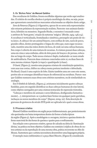 Das esculturas de Galdino, foram escolhidas algumas que serão aqui analisadas. O critério de escolha obedece à própria morfologia da obra, ou seja, peças que apresentam características marcantes relacionadas ao objetivo deste artigo. Seres da Natureza (Figura 2) é figurativa, apesar de os seres nela representados não estarem próximos da representação realista. Parecem-nos animais fantásticos, híbridos ou monstros. Segundo Hocke, o monstro é encarado como a antítese do ‘bom gosto,’ criação da natureza ‘mágica.’ (Hocke, 1974: 146,114). A escultura é verticalizada, frontalizada e simétrica, pressupõe um ponto de vista único. A cabeça é de um animal bizarro, com orelhas de rato, nariz de porco, grandes olhos, dentes pontiagudos e língua de cobra que, num esgar escancarado, mantém uma das mãos dentro da boca, de onde sai uma cabeça humana. Seu corpo é coberto de uma textura de escamas. A criatura possui duas cabeças, uma em cima e uma embaixo, além de dois pares de braços e de pernas, colocados ao longo do corpo. Tudo nessa criatura é duplo, traduzindo-se num estado de ambivalência. Parecem duas criaturas conectadas entre si, ou duas fases de uma mesma criatura: bípede (o topo) e quadrúpede (a base). O Guará, (Figura 3), mostra uma pequena criatura de constituição quimérica, com asas nas costas, chifres na cabeça numa postura insolente e debochada. No Brasil, Guará é uma espécie de lobo. Existe também uma ave com este nome, porém não se consegue identificar traços do referencial na escultura. Parece-nos que Galdino nomeava suas obras sem critérios narrativos, ou de similaridade ou analogia. Em O Símbolo de Salomão, (Figura 4), avistamos inicialmente quatro cabeças fundidas, para em seguida identificar as duas cabeças humanas do eixo lateral, como objetos carregados por uma criatura tentacular de expressão tristonha. “Cabeças e membros de animais e seres fabulosos, desfigurados fantasticamente(…), interpenetram-se e podem fazer brotar em qualquer parte gavinhas, inchaços ou novos membros do corpo” (Kayser, 2009: 22). Esta descrição de gravuras de grotescos do século XVII pode ser aplicada tal e qual a essas obras.