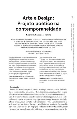 Martins, Nara Sílvia Marcondes (2011) “Arte e Design: Projeto poético na contemporaneidade” Revista :Estúdio. ISSN 1647-6158. Vol.2 (3): 363-367.