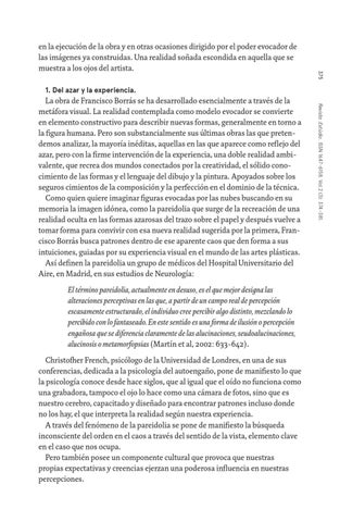 La obra de Francisco Borrás se ha desarrollado esencialmente a través de la metáfora visual. La realidad contemplada como modelo evocador se convierte en elemento constructivo para describir nuevas formas, generalmente en torno a la figura humana. Pero son substancialmente sus últimas obras las que pretendemos analizar, la mayoría inéditas, aquellas en las que aparece como reflejo del azar, pero con la firme intervención de la experiencia, una doble realidad ambivalente, que recrea dos mundos conectados por la creatividad, el sólido conocimiento de las formas y el lenguaje del dibujo y la pintura. Apoyados sobre los seguros cimientos de la composición y la perfección en el dominio de la técnica. Como quien quiere imaginar figuras evocadas por las nubes buscando en su memoria la imagen idónea, como la pareidolia que surge de la recreación de una realidad oculta en las formas azarosas del trazo sobre el papel y después vuelve a tomar forma para convivir con esa nueva realidad sugerida por la primera, Francisco Borrás busca patrones dentro de ese aparente caos que den forma a sus intuiciones, guiadas por su experiencia visual en el mundo de las artes plásticas. Así definen la pareidolia un grupo de médicos del Hospital Universitario del Aire, en Madrid, en sus estudios de Neurología:
