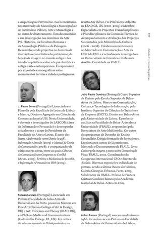 João Paulo Queiroz (Portugal) Curso Superior de Pintura pela Escola Superior de BelasArtes de Lisboa. Mestre em Comunicação, Cultura, e Tecnologias de Informação pelo Instituto Superior de Ciências do Trabalho e da Empresa (ISCTE). Doutor em Belas-Artes pela Universidade de Lisboa. É professor auxiliar na Faculdade de Belas-Artes desta Universidade (FBAUL), responsável pela licenciatura de Arte Multimédia. Co-autor dos programas de Desenho do Ensino Secundário. Dirigiu formação de formadores. Lecciona nos cursos de Licenciatura, Mestrado e Doutoramento da FBAUL. Livro Cativar pela imagem, 5 textos sobre Comunicação Visual FBAUL, 2002. Coordenador do Congresso Internacional CSO e director da :Estúdio. Diversas exposições individuais de pintura, sendo a última Outeiro dos Valinhos, Galeria Cirurgias Urbanas, Porto, 2009. Subdirector da FBAUL. Prémio de Pintura Gustavo Cordeiro Ramos pela Academia Nacional de Belas-Artes em 2004.