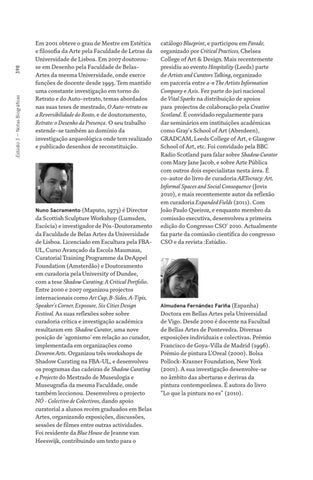 da Scottish Sculpture Workshop (Lumsden, Escócia) e investigador de Pós-Doutoramento da Faculdade de Belas Artes da Universidade de Lisboa. Licenciado em Escultura pela FBAUL, Curso Avançado da Escola Maumaus, Curatorial Training Programme da DeAppel Foundation (Amsterdão) e Doutoramento em curadoria pela University of Dundee, com a tese Shadow Curating; A Critical Portfolio. Entre 2000 e 2007 organizou projectos internacionais como Art Cup, B-Sides, A-Tipis, Speaker’s Corner, Exposure, Six Cities Design Festival. As suas reflexões sobre sobre curadoria crítica e investigação académica resultaram em Shadow Curator, uma nove posição de 'agonismo' em relação ao curador, implementada em organizações como Deveron Arts. Organizou três workshops de Shadow Curating na FBA-UL, e desenvolveu os programas das cadeiras de Shadow Curating e Projecto do Mestrado de Museulogia e Museugrafia da mesma Faculdade, onde também leccionou. Desenvolveu o projecto NÓ - Colectivo de Colectivos, dando apoio curatorial a alunos recém graduados em Belas Artes, organizando exposições, discussões, sessões de filmes entre outras actividades. Foi residente da Blue House de Jeanne van Heeswijk, contribuindo um texto para o