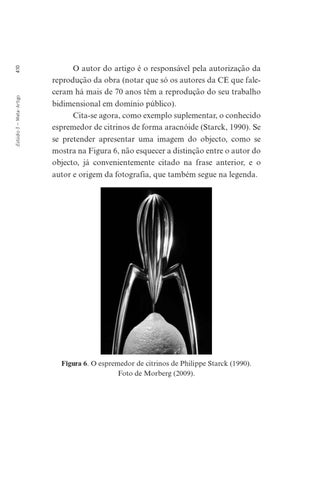 O autor do artigo é o responsável pela autorização da reprodução da obra (notar que só os autores da CE que faleceram há mais de 70 anos têm a reprodução do seu trabalho bidimensional em domínio público). Cita-se agora, como exemplo suplementar, o conhecido espremedor de citrinos de forma aracnóide (Starck, 1990). Se se pretender apresentar uma imagem do objecto, como se mostra na Figura 6, não esquecer a distinção entre o autor do objecto, já convenientemente citado na frase anterior, e o autor e origem da fotografia, que também segue na legenda.