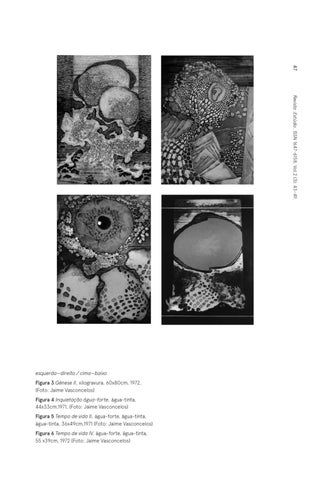 esquerda—direita / cima—baixo Figura 3 Génese II, xilogravura, 60x80cm, 1972, (Foto: Jaime Vasconcelos) Figura 4 Inquietação água-forte, água-tinta, 44x33cm,1971, (Foto: Jaime Vasconcelos) Figura 5 Tempo de vida II, água-forte, água-tinta, água-tinta, 36x49cm,1971 (Foto: Jaime Vasconcelos) Figura 6 Tempo de vida IV, água-forte, água-tinta, 55 x39cm, 1972 (Foto: Jaime Vasconcelos)