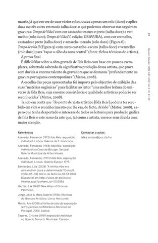 matriz, já que em vez de usar vários rolos, usava apenas um rolo (duro) e aplica duas ou três cores em modo talha doce, o que podemos observar nas seguintes gravuras: Tempo de Vida I com cor castanho-escuro e preto (talha doce) e vermelho (rolo duro); Tempo de Vida IV; edição: GRAVURA), com cor vermelho, castanho e preto (talha doce) e amarelo-torrado (rolo duro) (Figura 6); Tempo de vida II (Figura 5) com cores castanho-escuro (talha doce) e vermelho (rolo duro) para “tapar o olho da zona central” (fonte: fichas técnicas de artista). A prova final. É difícil falar sobre a obra gravada de Ilda Reis com base em poucos exemplares, sobretudo sabendo da significativa produção dessa artista, que prova sem dúvida o enorme talento da gravadora que se destacou “profundamente na gravura portuguesa contemporânea” (Matos, 2008). A escolha das peças apresentadas foi imposta pelo objectivo de exibição das suas “matérias orgânicas” para facilitar ao leitor “uma melhor leitura do universo de Ilda Reis, cuja enorme consistência e qualidade artísticas poderão ser reconhecidas” (Matos, 2008). Tendo em conta que "do ponto de vista artístico [Ilda Reis] poderia ter recebido em vida o reconhecimento que lhe era, de facto, devido” (Matos, 2008), espero que tenha despertado o interesse de todos os leitores para produção gráfica de Ilda Reis e este ramo da arte que, tal como a artista, merece sem dúvida uma maior atenção.